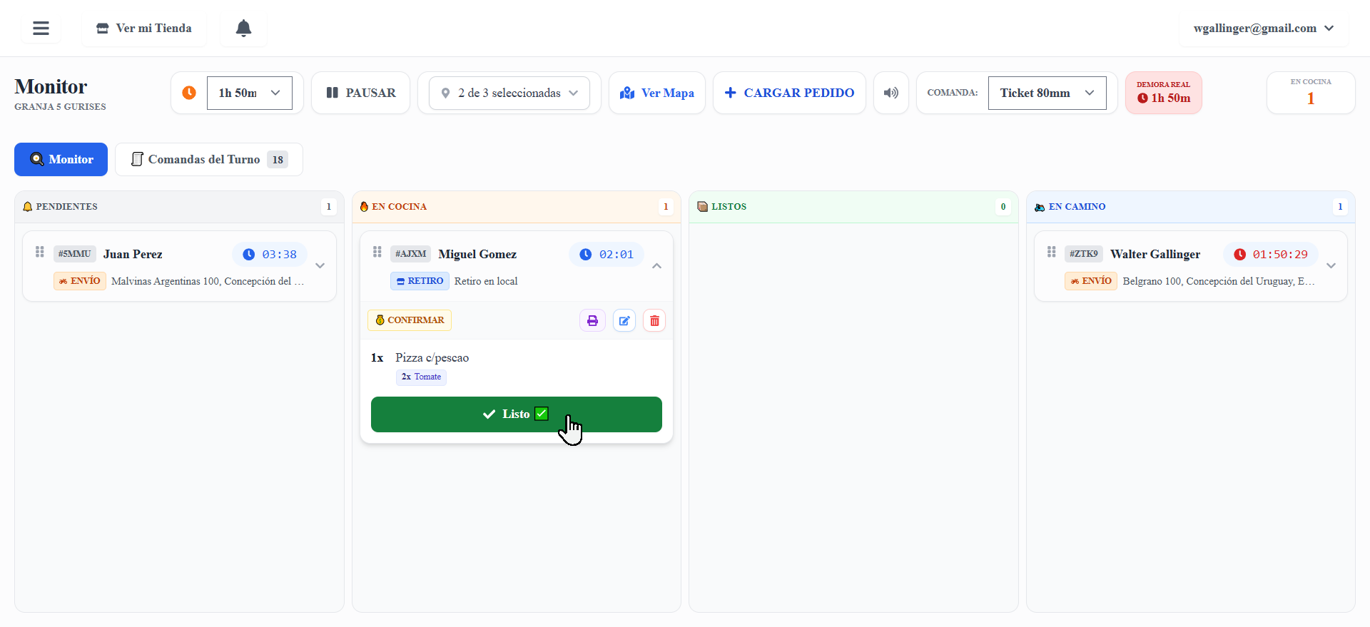 Todos los pedidos en una pantalla. Estados claros, tiempos visibles.